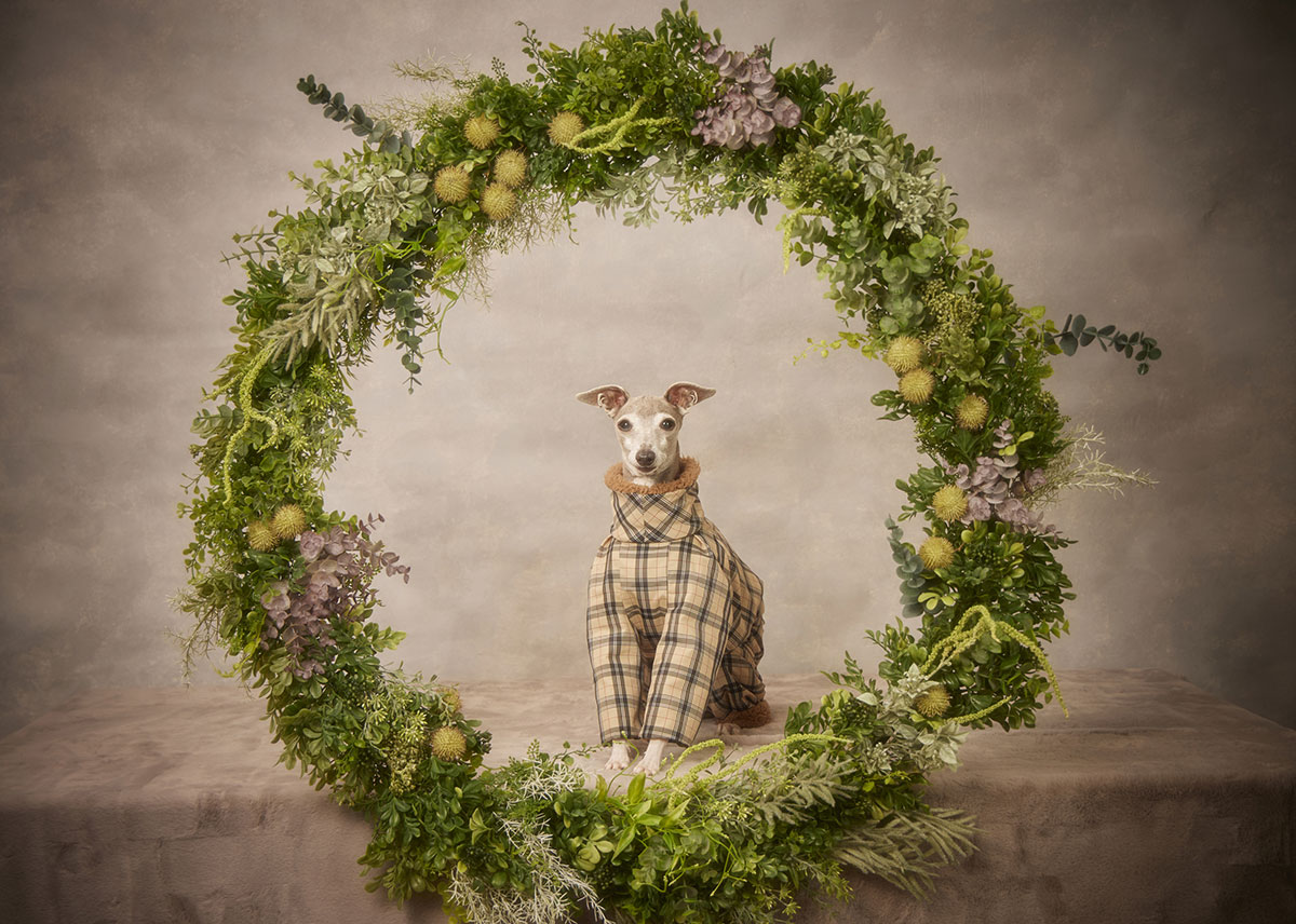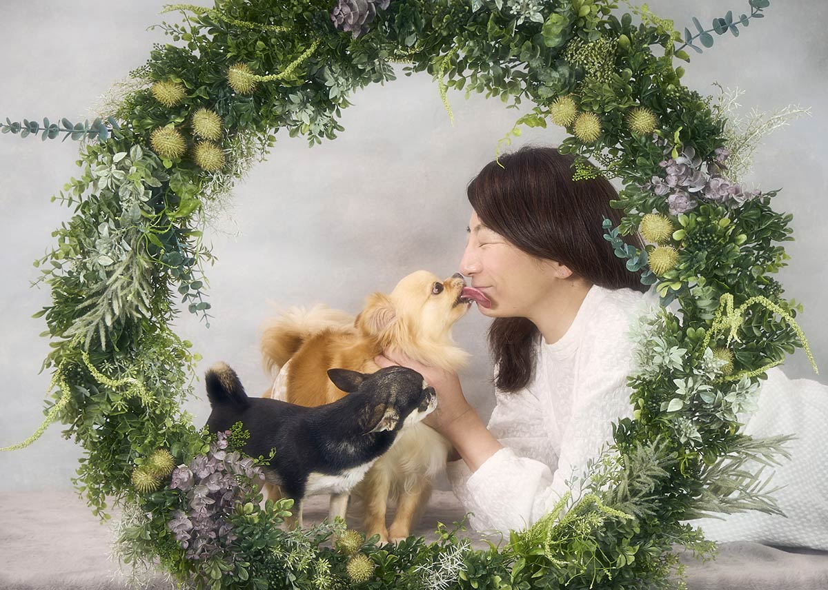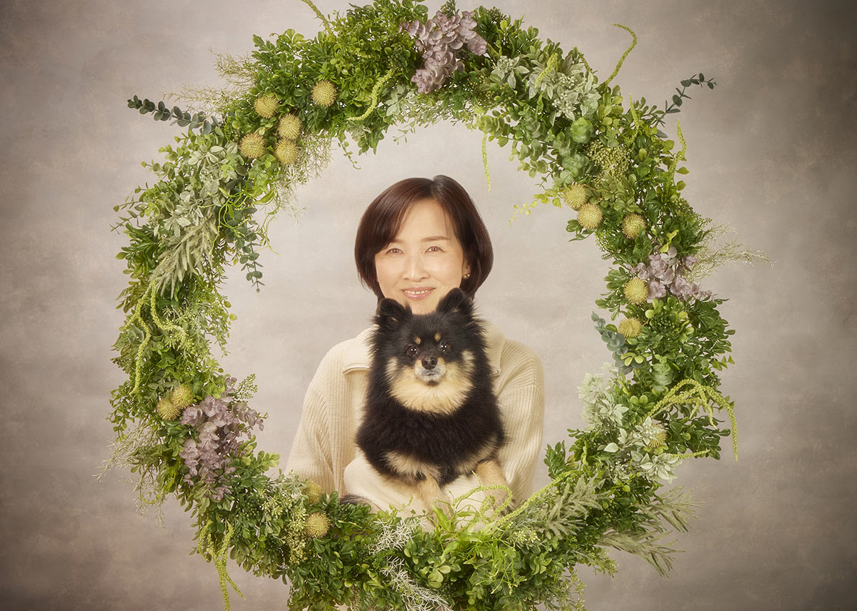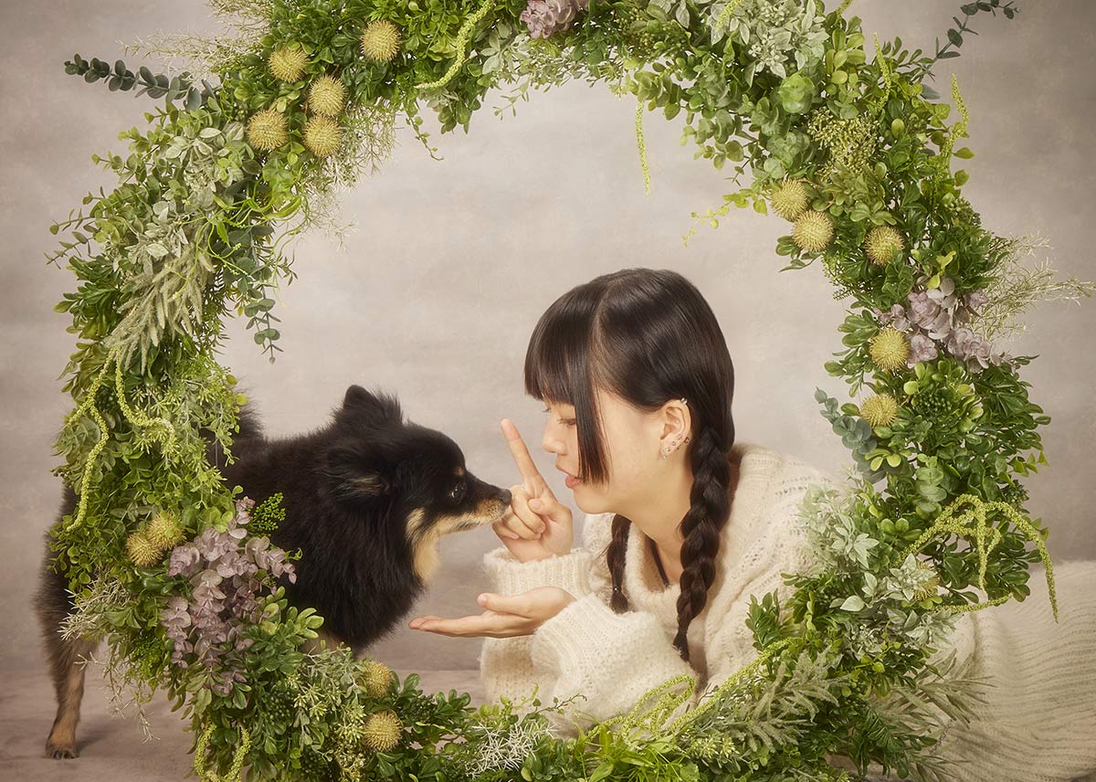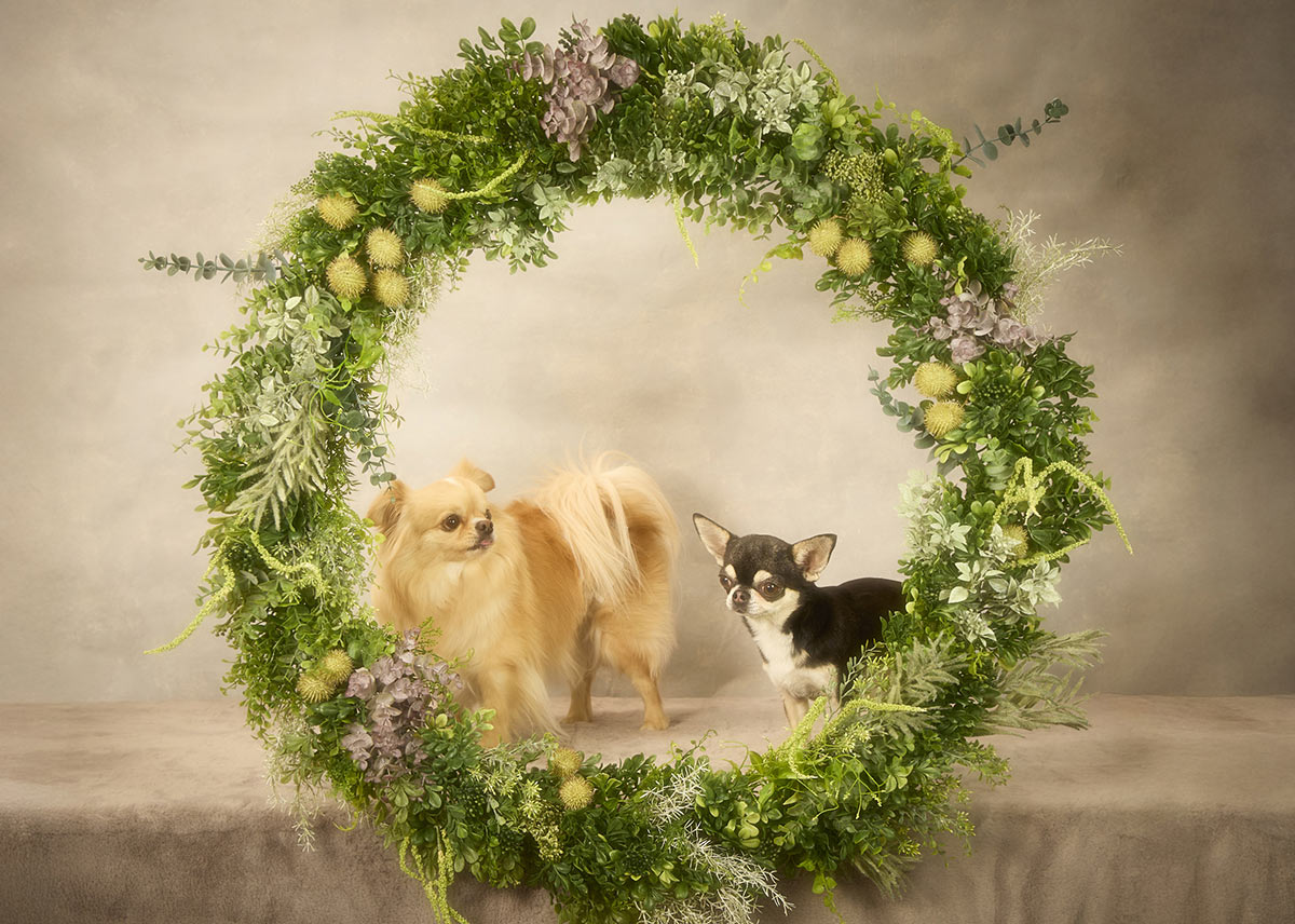 ⼤きなリースにぎゅっと寄り添って撮ると、⾃然と絆が感じられるような⼀枚に。